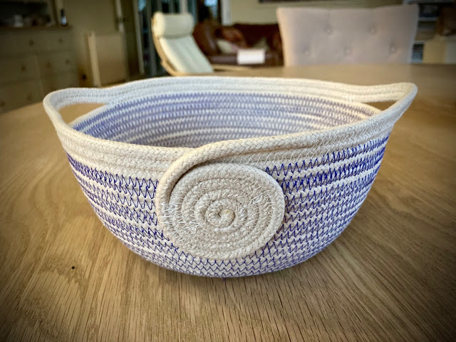 This is my latest fad - rope bowls made with cotton clothes line or pulley rope, using a zig-zag stitch on the sewing machine. These are satisfying and strangely soothing to make as the coils are added and all you have to concentrate on is keeping the zig-zag stitch on the right line.